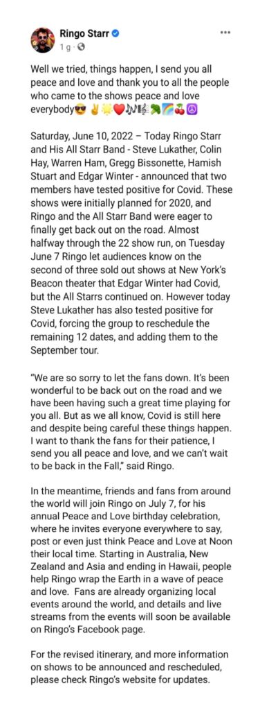 Ringo Starr and his All Starr Band ( Steve Lukather, Gregg Bissonette, Warren Ham, Edgar Winter, Colin Hay and Hamish Stuart) has postponed 12 dates of their tour due to covid.